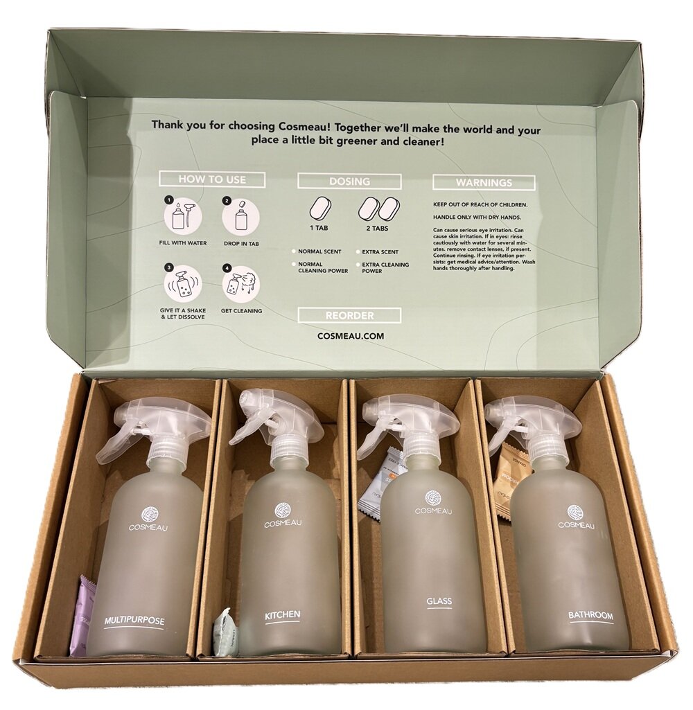 Beter schoonmaken begint hier. Cosmeau starterkit met 4 flessen en tabletten. Minder plastic, minder afval, meer gemak.